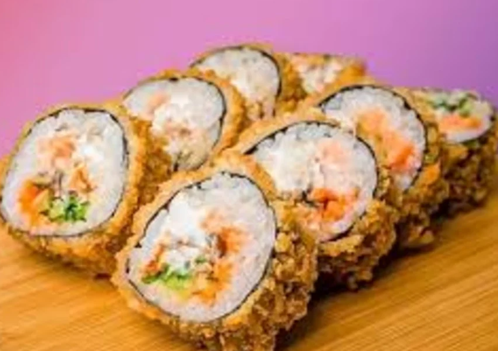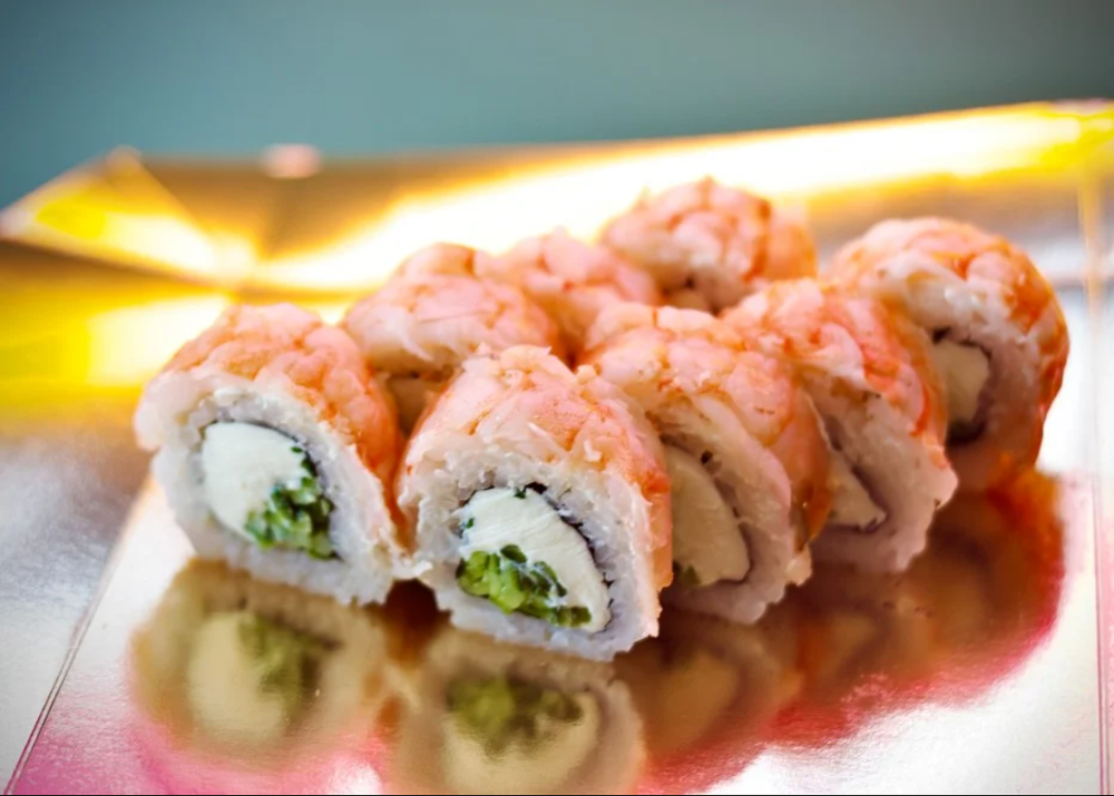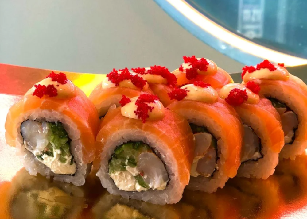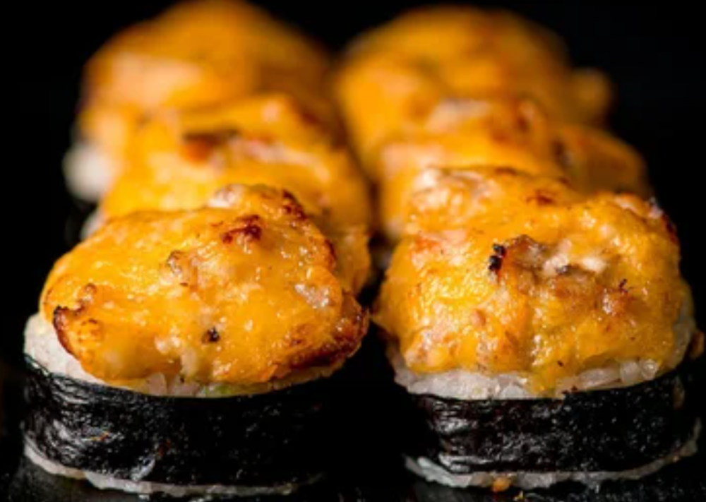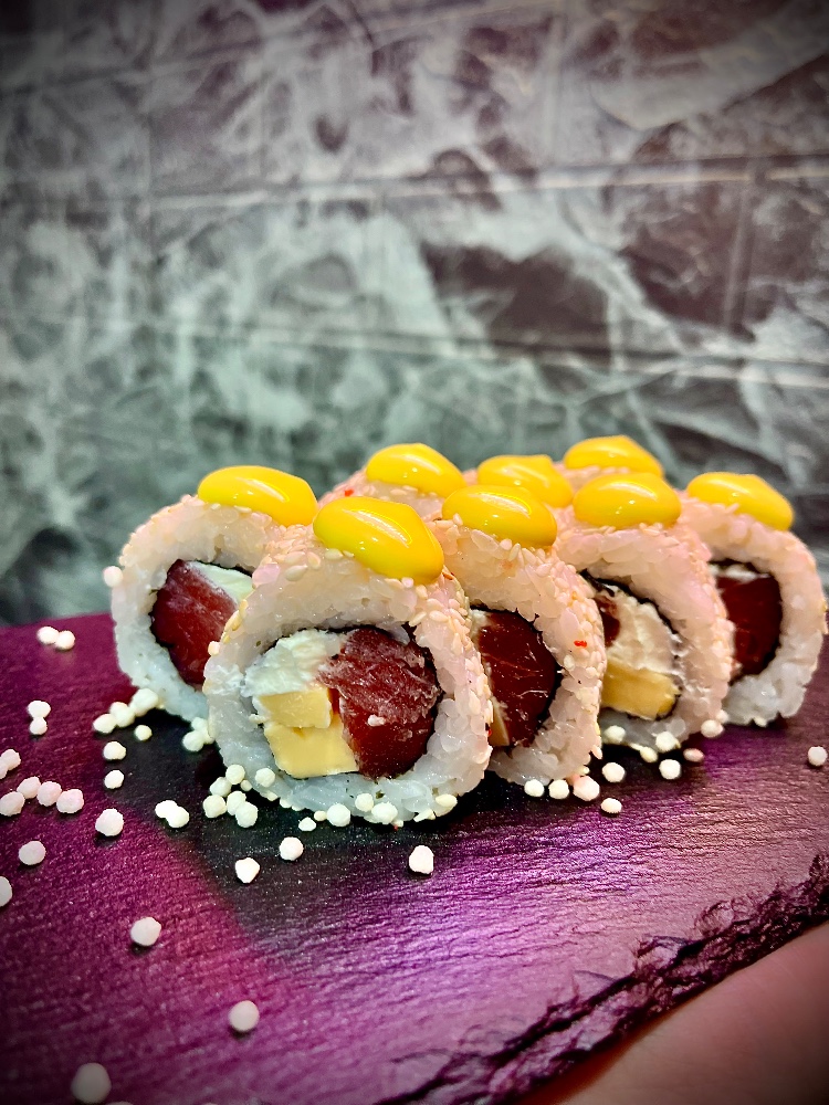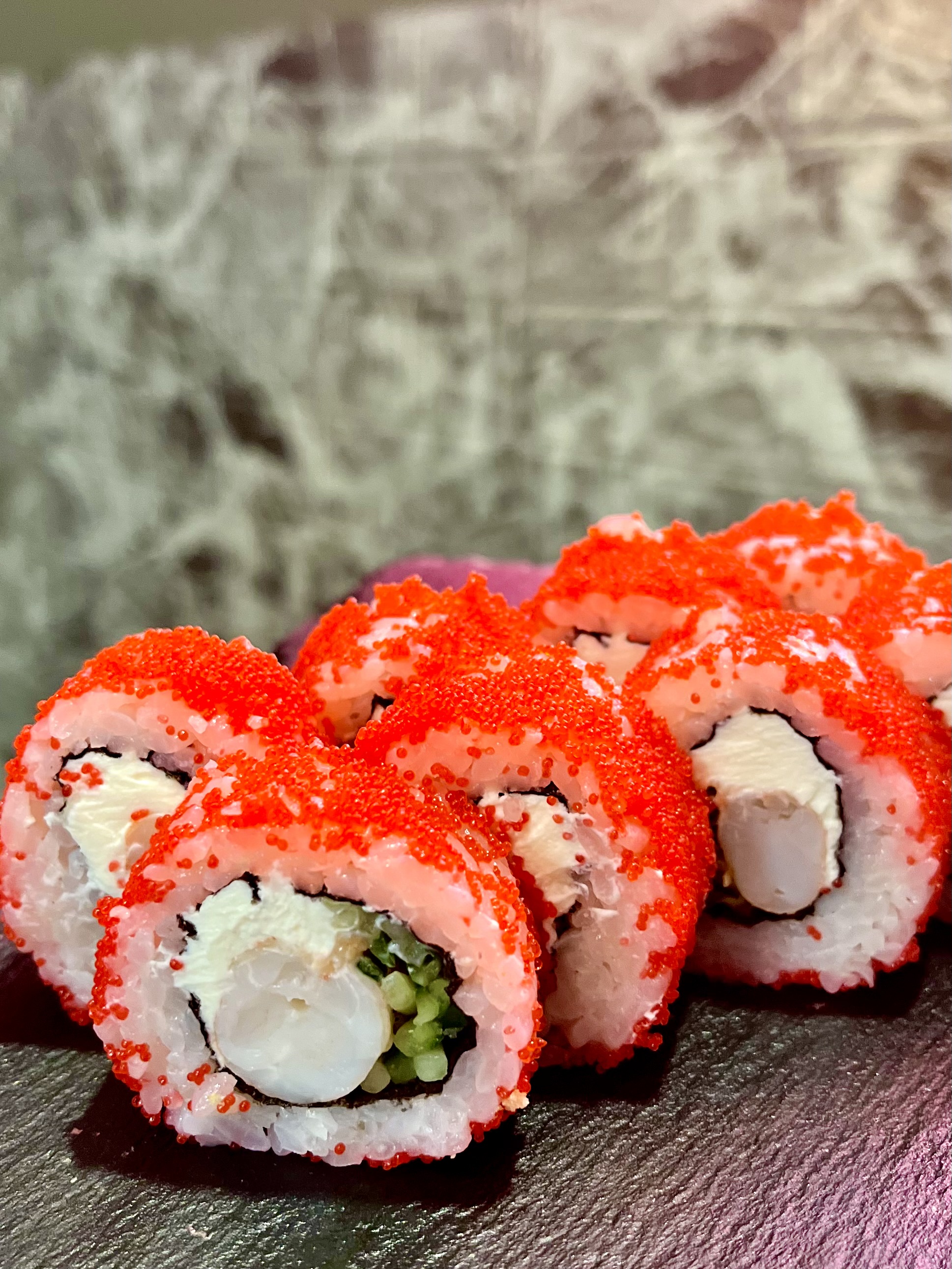 - Рол каліфорнія спайсі з шапочкою сурімі та лососем
