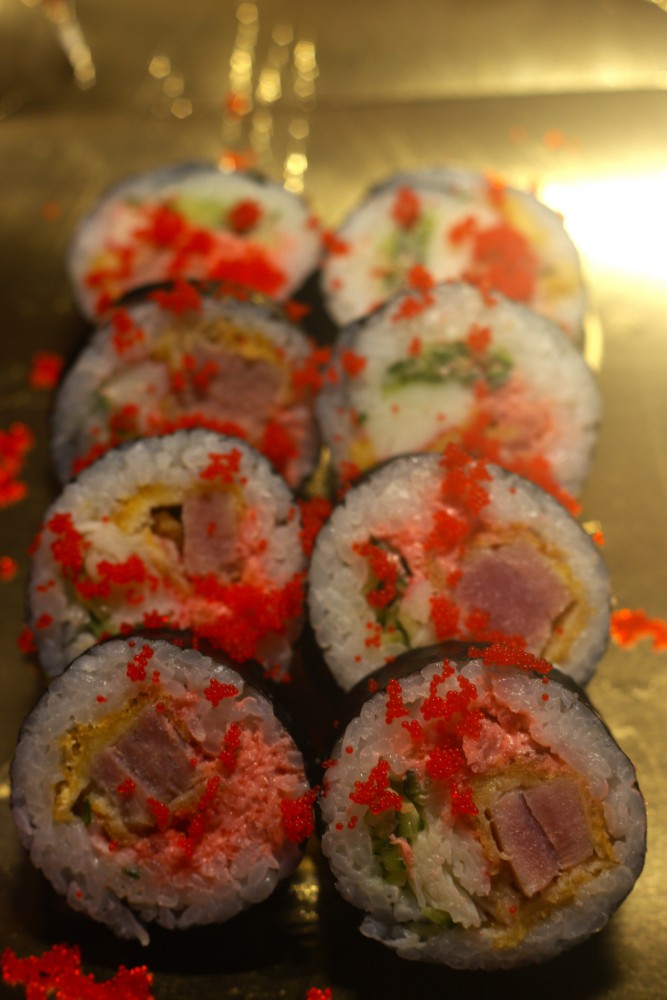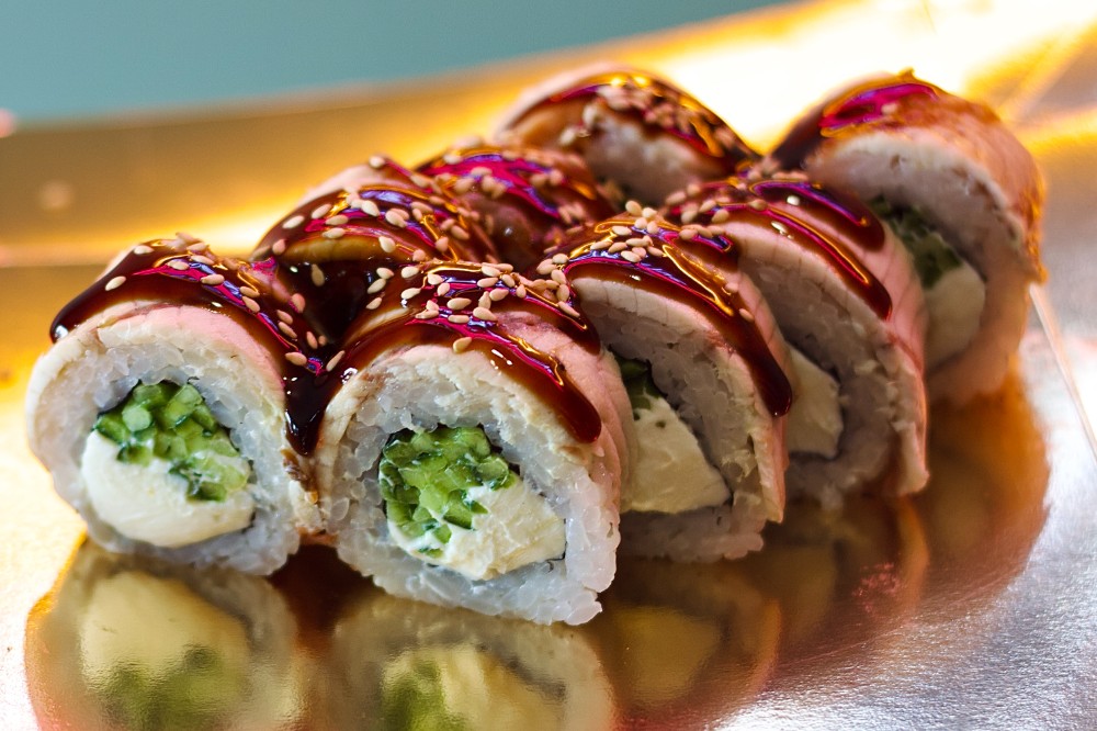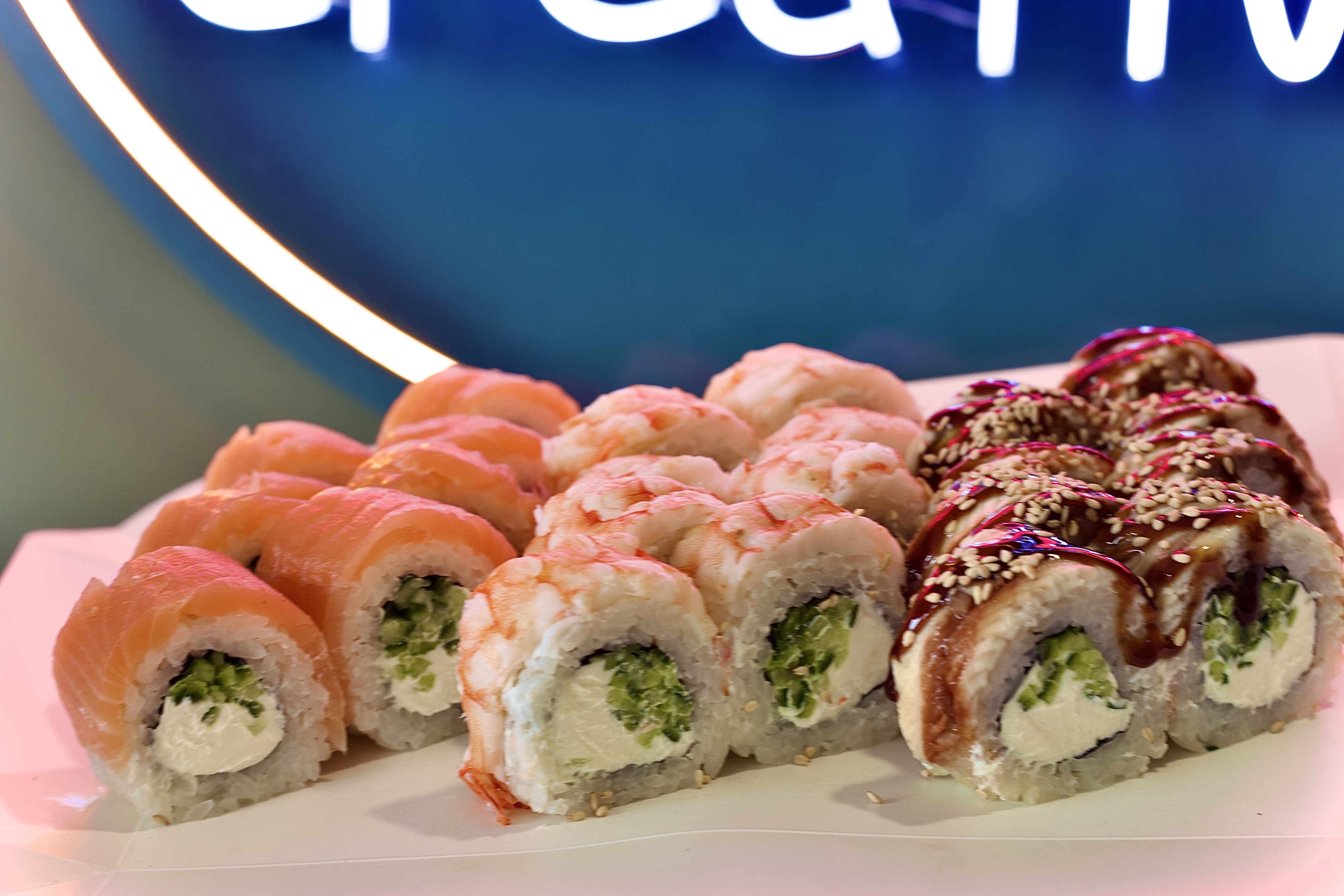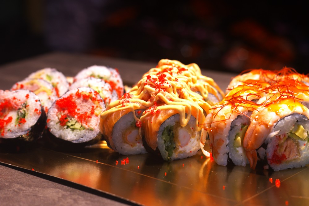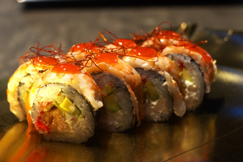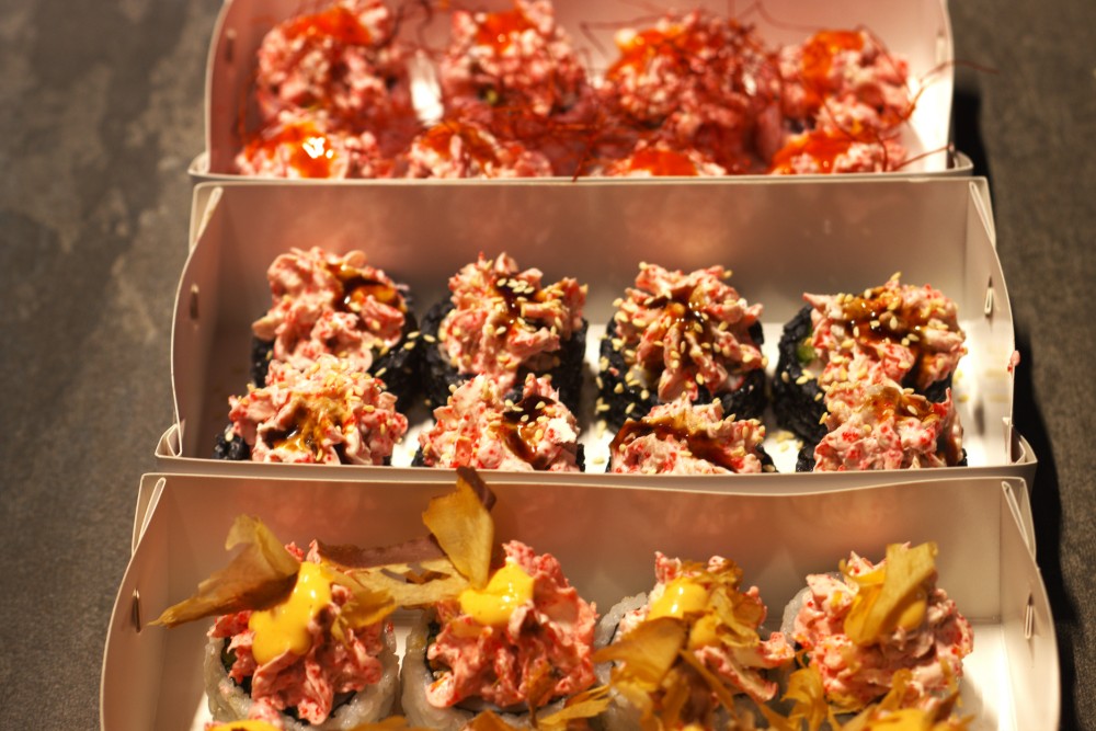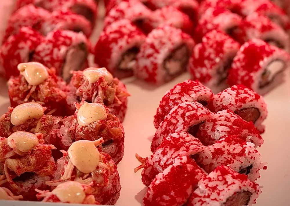 - Рол каліфорнія спайсі з шапочкою сурімі та лососем
