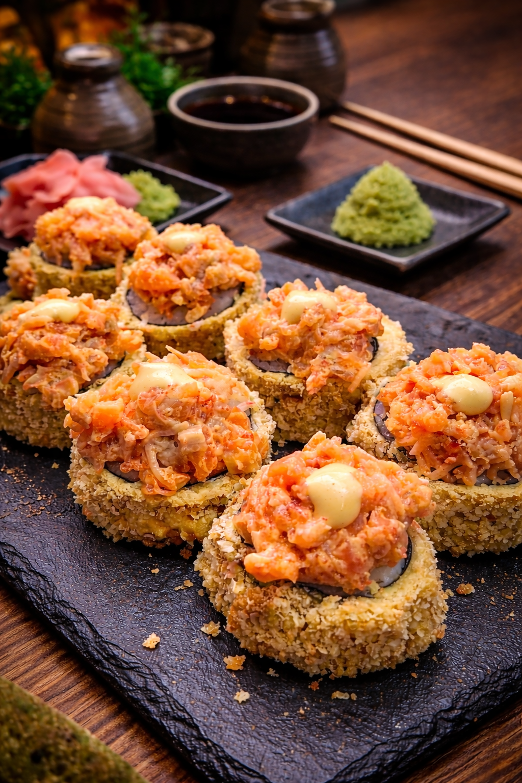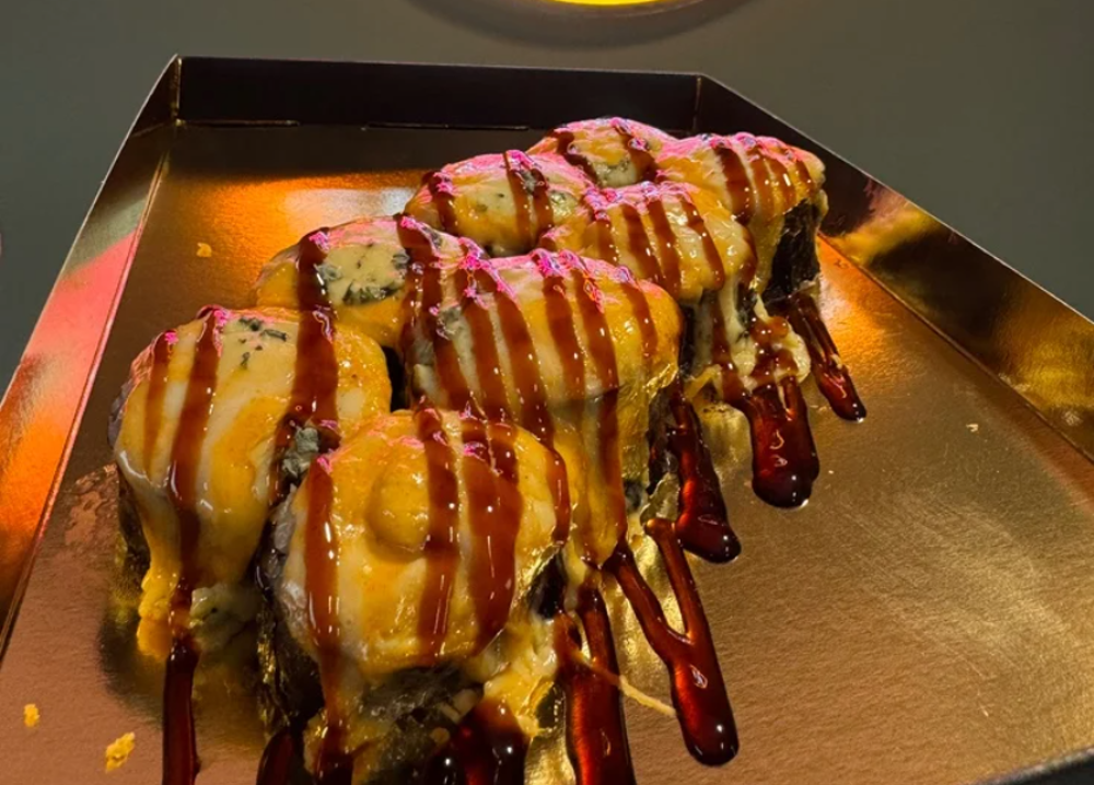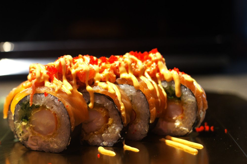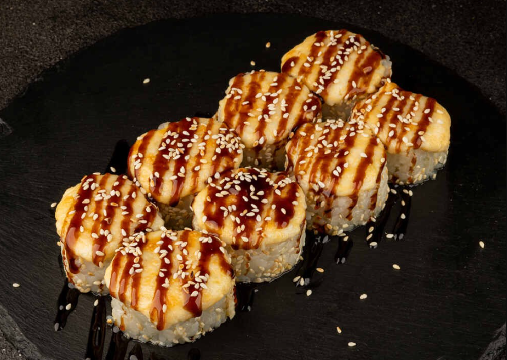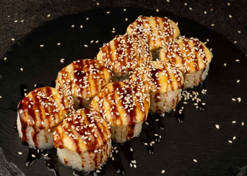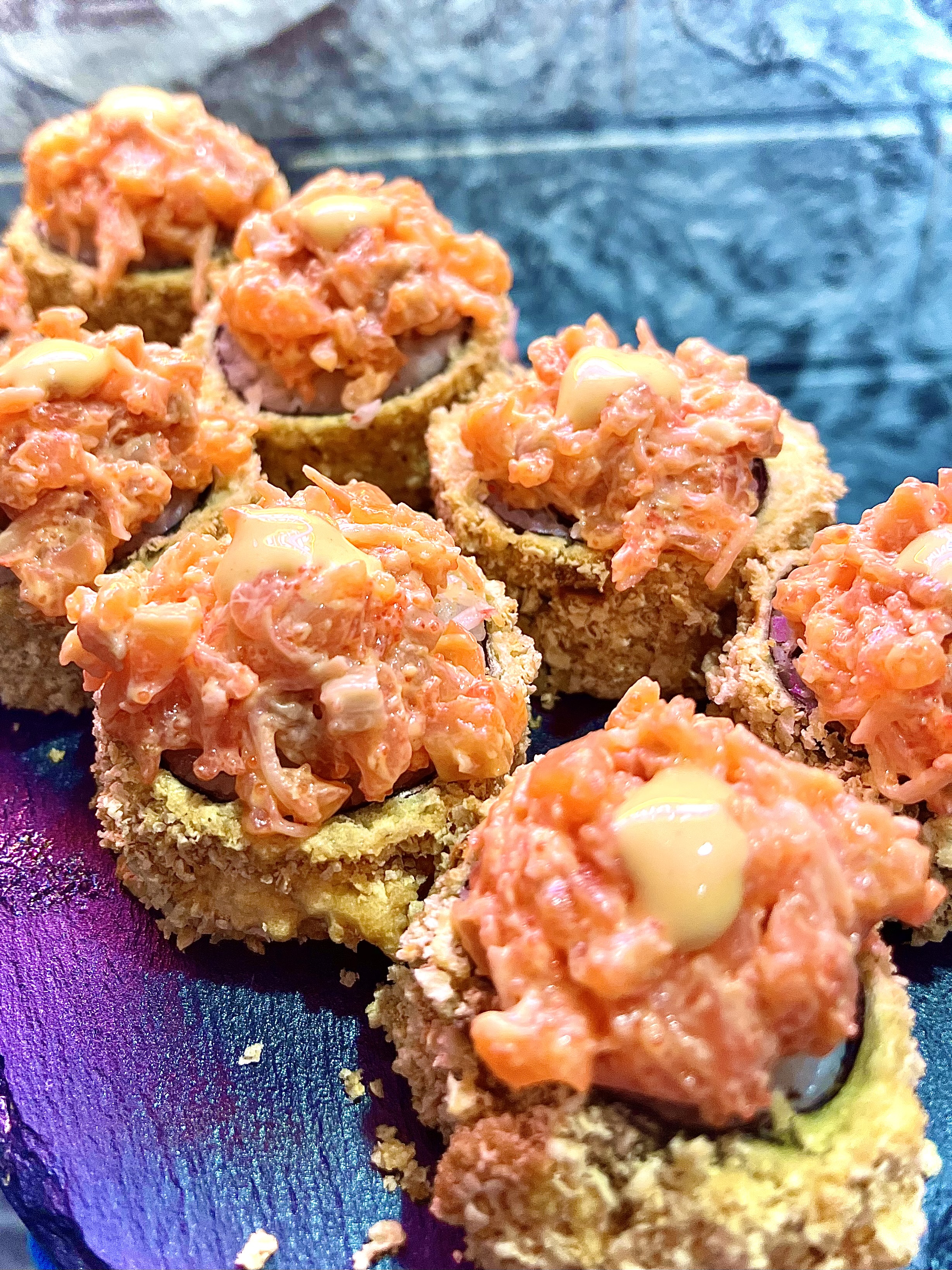 Рол каліфорнія спайсі з шапочкою сурімі та лососем